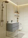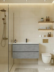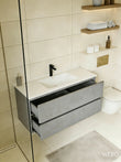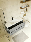De betonlook onderkast is uitgerust met 2 royale lades waarin je al je badkamer- en verzorgingsproducten overzichtelijk kunt opbergen. Het soft open- en close systeem zorgt ervoor dat de lades soepel en geluidloos openen en sluiten. De geïntegreerde handgrepen benadrukken het strakke, minimalistische design.