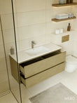 De eiken onderkast beschikt over 2 royale lades waarin je al je badkamer- en verzorgingsproducten overzichtelijk kunt opbergen. Het soft open- en close systeem zorgt ervoor dat de lades soepel en geluidloos bewegen. Dankzij de geïntegreerde handgrepen krijgt het meubel een minimalistische, moderne look.