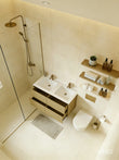 De eiken onderkast beschikt over 4 extra brede lades met volop ruimte voor al je verzorgings- en badkamerproducten. Dankzij het soft open- en close systeem openen en sluiten de lades soepel en geluidloos. De geïntegreerde handgrepen versterken de strakke en minimalistische uitstraling.